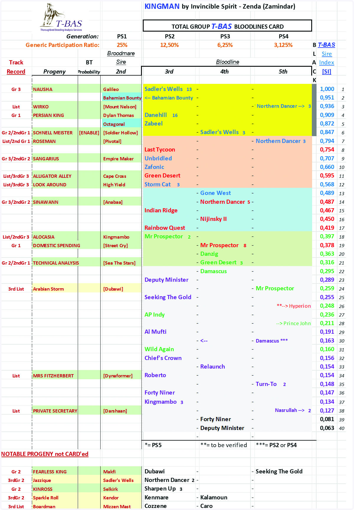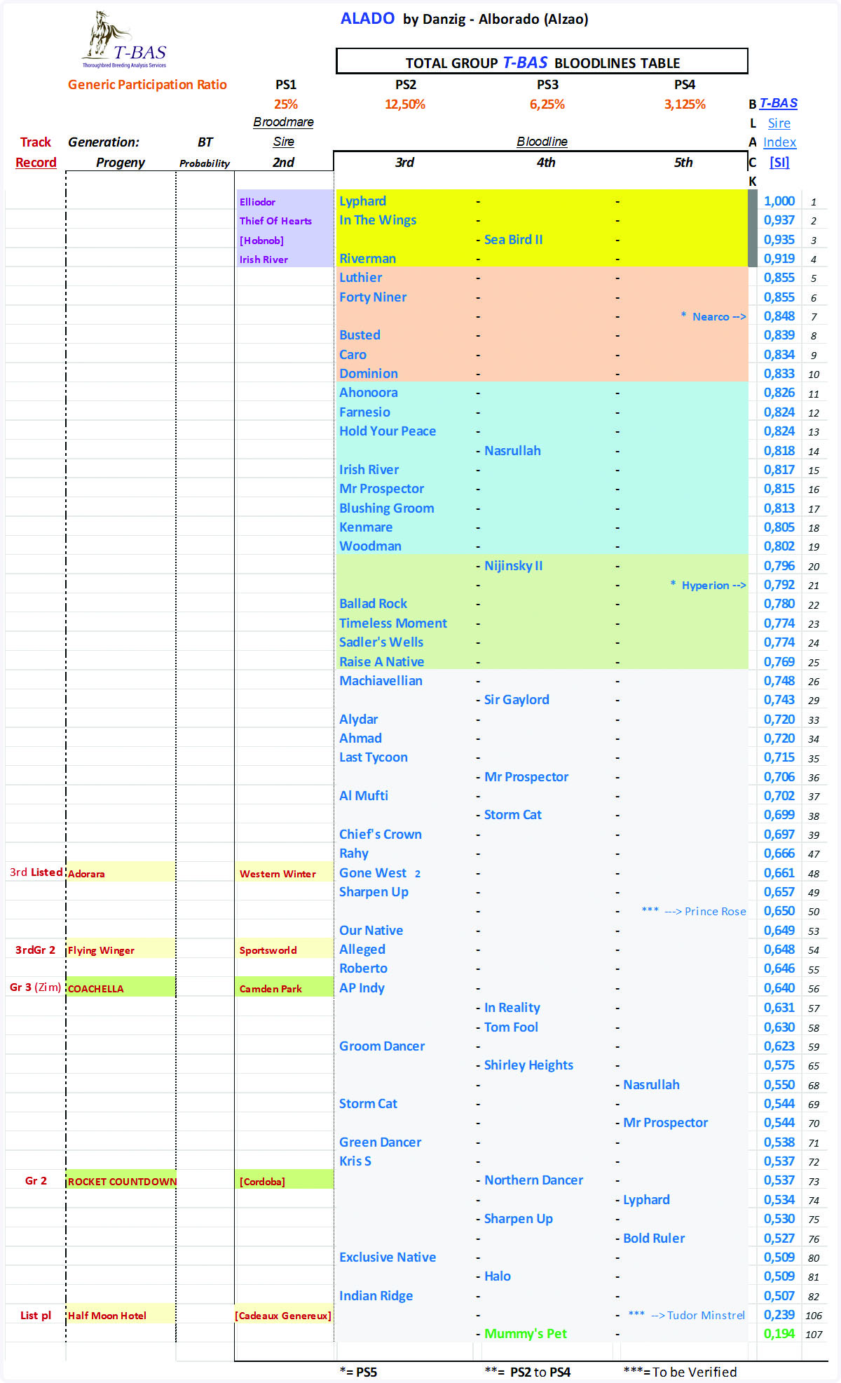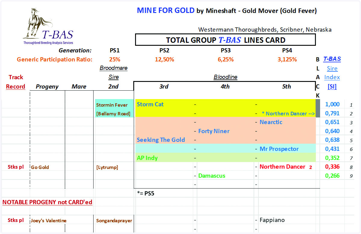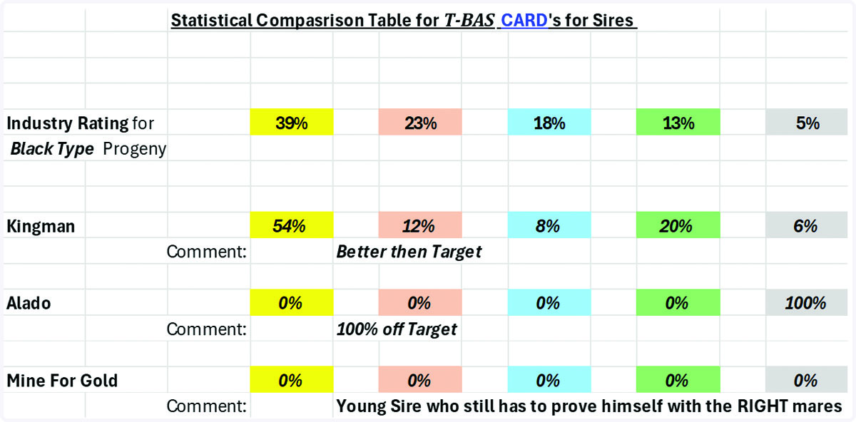 At this stage MINE FOR GOLD has only produced three (3) Stakes placed progeny. The 2 behind “Northern Dancer 2” indicates that there are 2 progeny, with Northern Dancer in the PS4 position. It may be too early to judge his status as a successful Sire and this T-BAS CARD is newly generated but there is going to the need to choose many more RIGHT mares in the YELLOW and ORANGE Bands to set him on the map. It may be that this Sire can still be saved before being considered as a failed Sire.